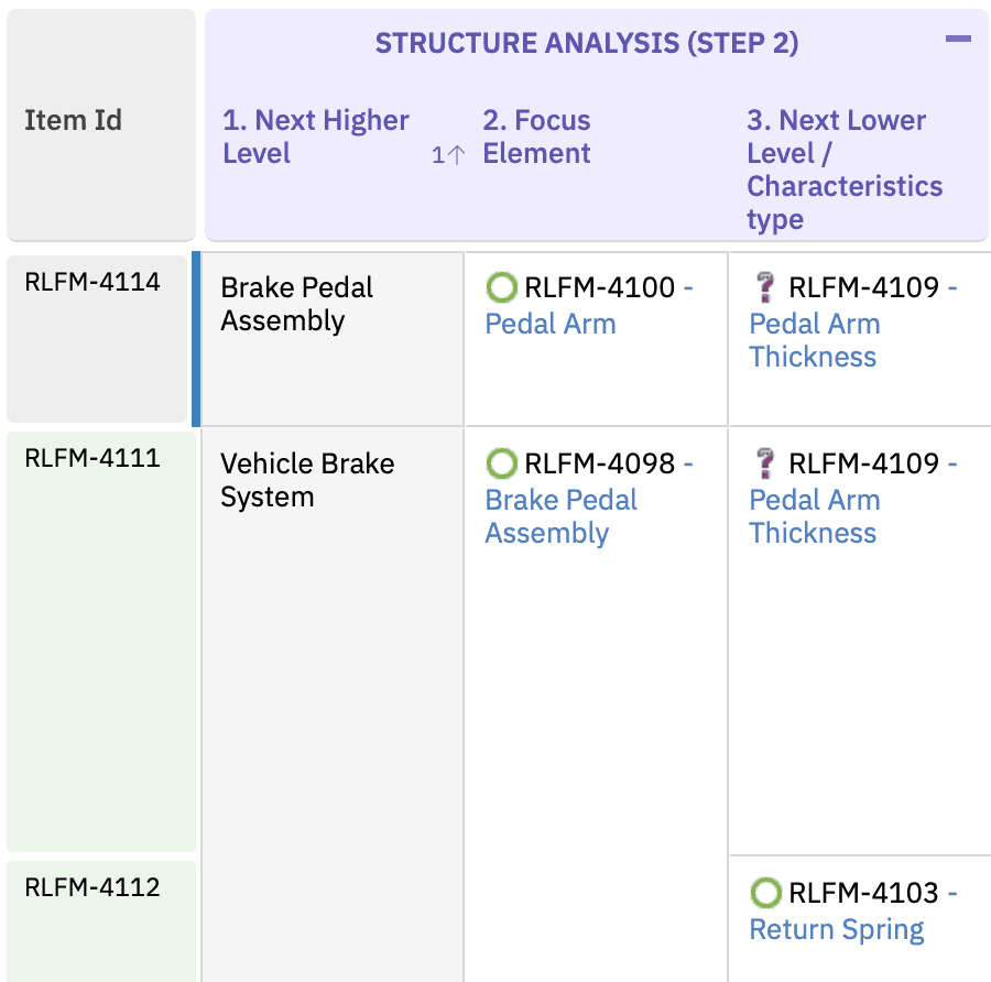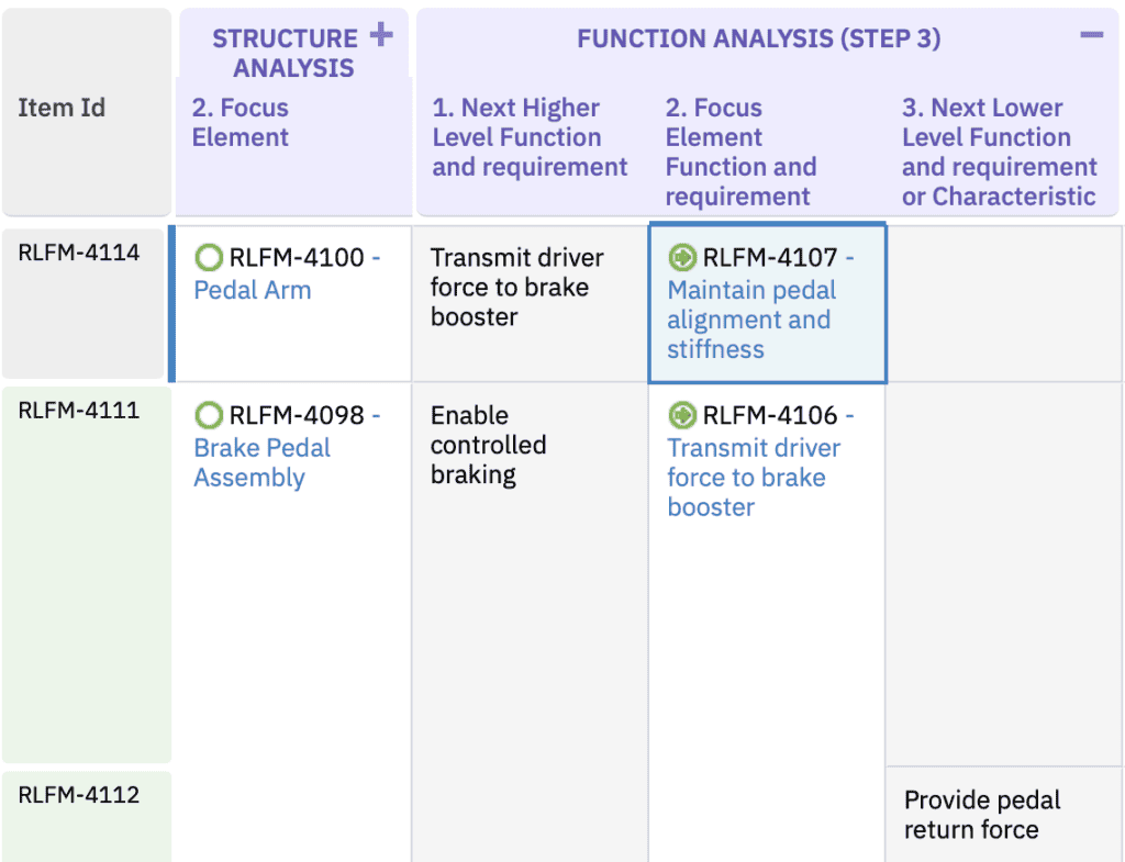 3. Next Lower Level Function and Requirement or Characteristic | Function or requirement of linked lower element / characteristic | ❌ Read-only (derived from characteristic target’s backlinks) | Connects functional dependence to lower-level features (§6.3.3). Empty if target is Characteristic. |