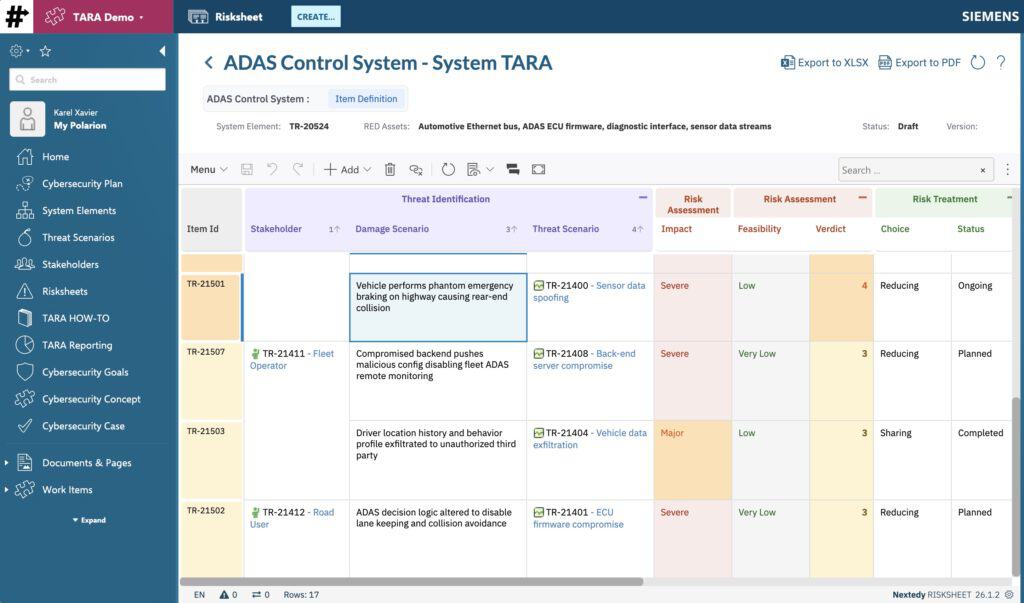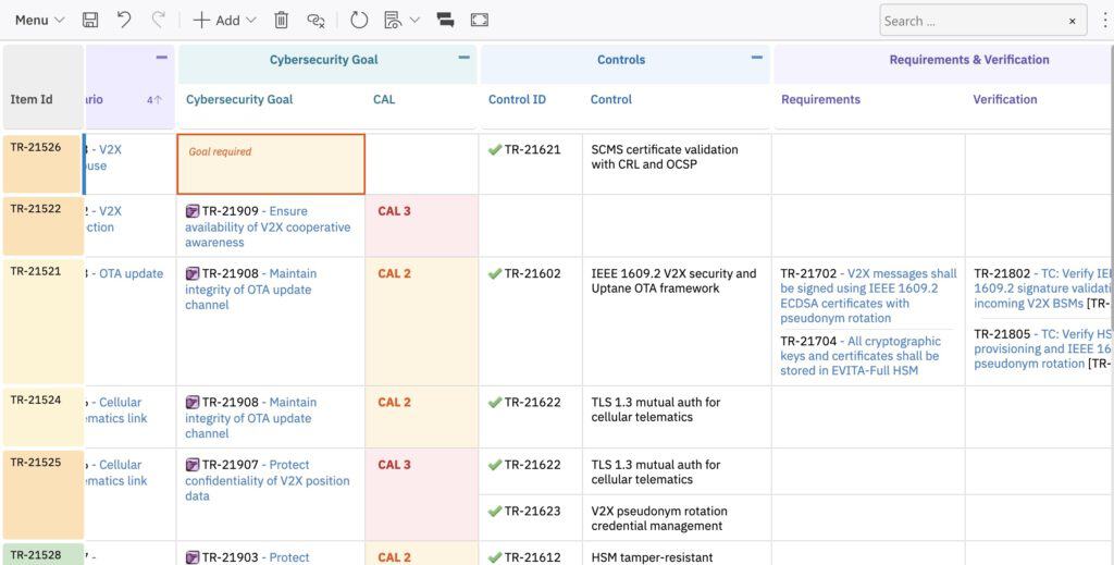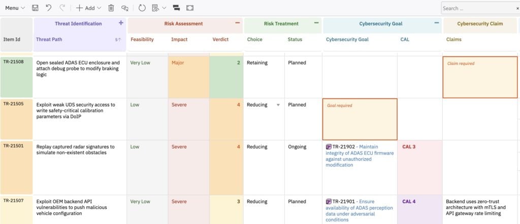 ISO/SAE 21434 threat analysis with automated scoring, built-in traceability, and zero spreadsheet chaos.